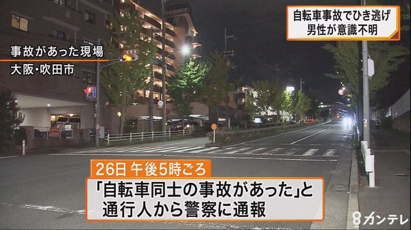 26日夕方、吹田市佐井寺で自転車同士の交通事故がありました。一方の方は意識不明の重体、もう一方は逃走し、警察がひき逃げとして捜査しています。