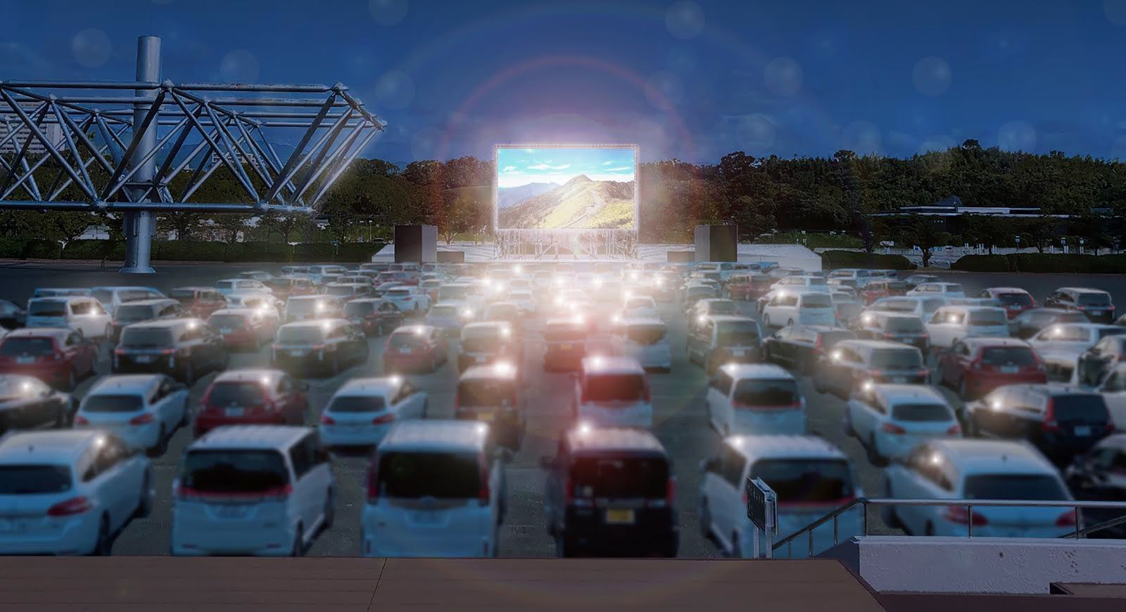 スクリーンは、横12メートル、縦5.5メートルの600インチ。映画館だと200~300席規模のサイズ感かと思います。イメージ図からも想像できるように、お祭り広場のサイズを思うと、映画館と同じ迫力とまではいきませんが、車の中で周りを気にせずに楽しめるのが特徴です。1回の上映で最大200台です。