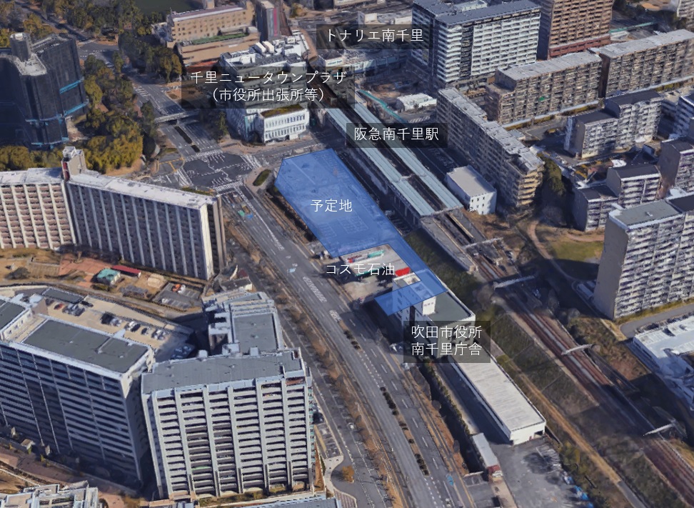 阪急南千里駅西側の駐車場だった土地と隣接地を使用し、北消防署の一部機能に加えて、中消防庁舎(吹田市五月が丘南)を移転、さらに土木部、教育センターの事務室なども設けることが検討されています。